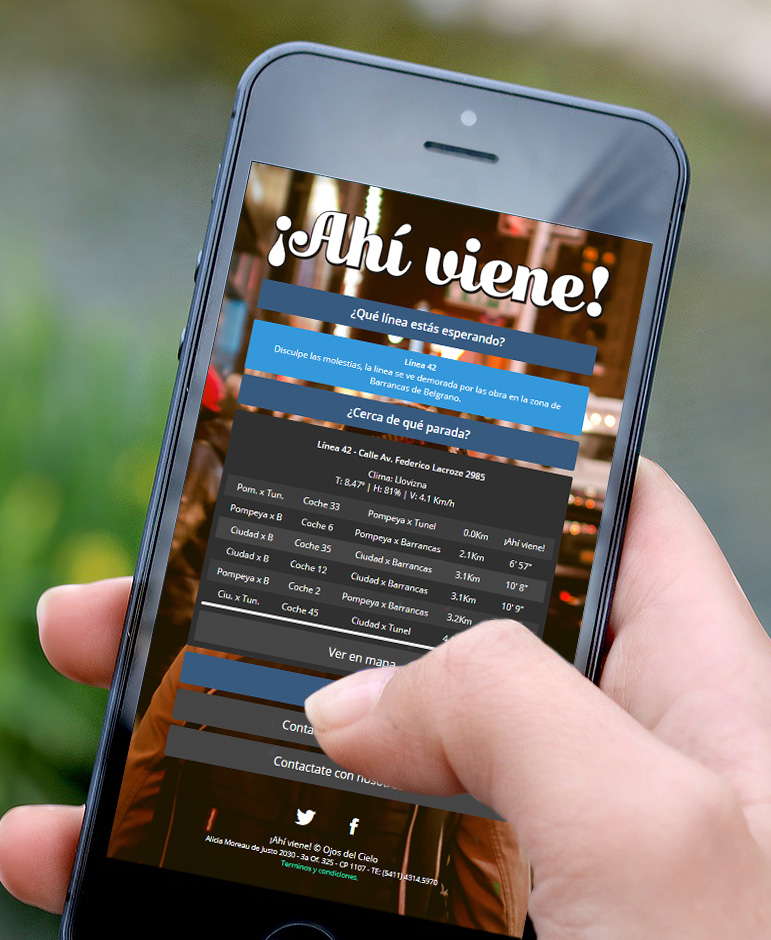 ¡Ahí viene! es un sistema de servicio e información al usuario de transporte público que fue creado para conectar las empresas con sus clientes, permitiendo a estos acceder a información de interés sobre sucesos presentes y futuros como también el servicio de mensajería entre ambos, al mismo tiempo que genera estadísticas útiles para la empresa con la finalidad de incrementar su eficiencia.